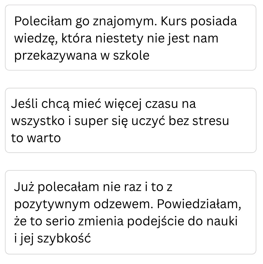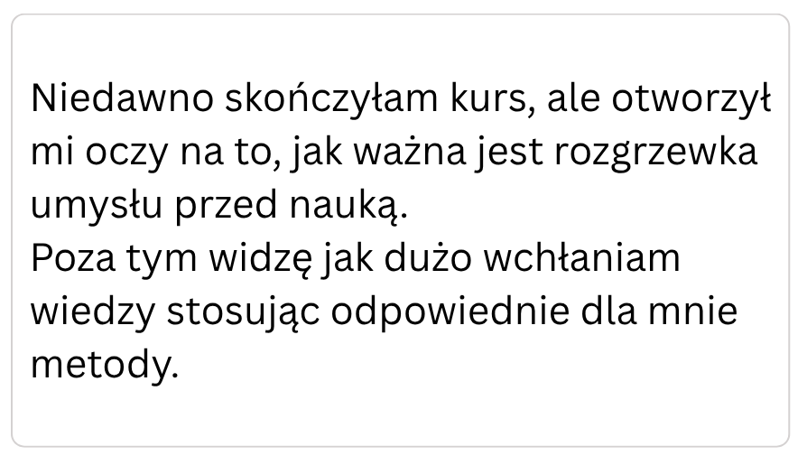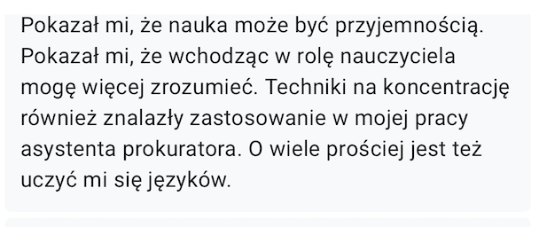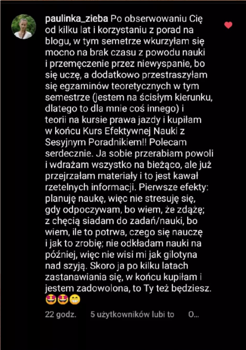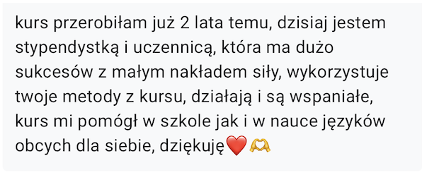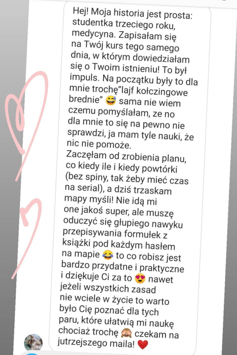 "Hey, chciałam tylko napisać, że odkryłam cie kiedy prowadziłam studygrama i zaczęłam śledzić twoje Story itp. Ogólnie, nie jestem wielką fanka żadnych couchow, wykładów motywacyjnych i z przykrością muszę stwierdzić, że wlasnie dlatego trzymałam dystans do twojej twórczości. Całe szczęście do sie zmieniło. Myśle, że pierwszym momentem był zakup kursu efektywnej nauki. Nie powiem, wahałam sie. Stwierdziłam, że tyle juz przeczytałam książek, stron internetowych, że chyba nic nie jest w stanie mnie zaskoczyć i polepszyć moją naukę. Poza tym jako biedna uczennica, kasa tez grała ważna role. Jednak po przeczytaniu wielozdaniowych pozytywnych komentarzy dotyczących tego kursu stwierdziłam, że coś w nim musi byc. Poza tym, moja babcia zawsze mówie na edukacji nie należy oszczędzać. I nie pomyliłam sie haha. Oglądając twój kurs, czułam sie jakby oglądała siebie za pare lat z większym zasobem wiedzy, którą chciałam bardzo szybko wchłonąć. Te wszystkie plany, mapy- uwielbiam to 😍 Cenie cie bardzo za tą wiedze ale tez za sposób jej przekazania bo korzystając ze swoich doświadczeń dobrze wiesz, że w doba ogranicza sie do 24h i jest tez pare innych spraw do załatwienia. Zdrowe podejście to jest wlasnie to czego zawsze sie obawiam wśród kursów tego typu. Dzięki temu kursowi stałam sie tez regularna czytelniczką twojego bloga, wszystkie starsze posty juz zdążyłam nadrobić. Cieszę sie, że na półmetku mojej edukacji znalazłam w końcu kogoś kto powiedział mi jak zdobyć wiedze i zachować ją na dłużej. Baaaaardzooo ci dziękuje za to co robisz. Juz nie mogę sie doczekać użycia wiedzy z kursu pod czas nauki do matury a tym czasem, zajmę sie szlifowaniem hiszpańskiego xoxo"