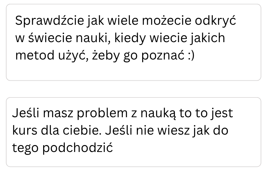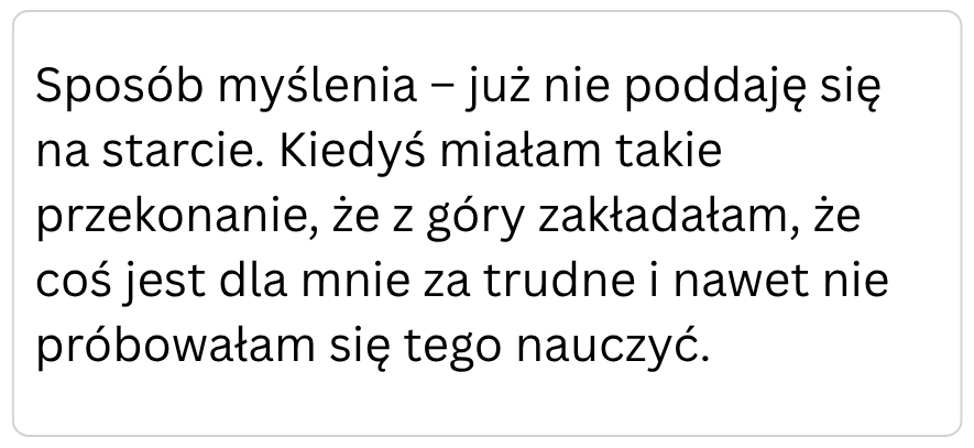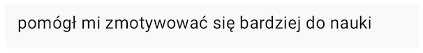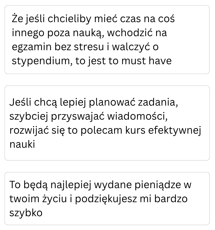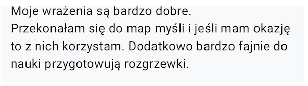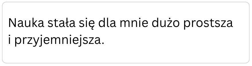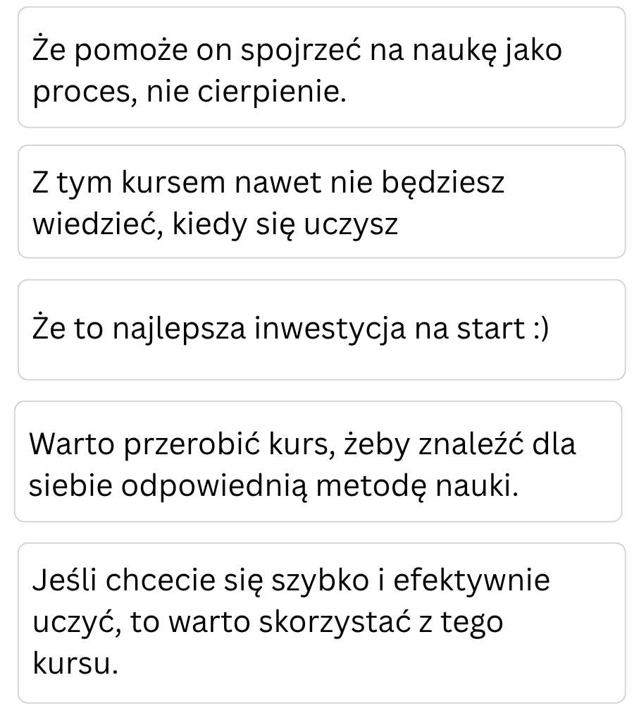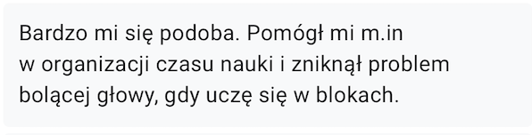 "Hey, chciałam tylko napisać, że odkryłam cie kiedy prowadziłam studygrama i zaczęłam śledzić twoje Story itp. Ogólnie, nie jestem wielką fanka żadnych couchow, wykładów motywacyjnych i z przykrością muszę stwierdzić, że wlasnie dlatego trzymałam dystans do twojej twórczości. Całe szczęście do sie zmieniło. Myśle, że pierwszym momentem był zakup kursu efektywnej nauki. Nie powiem, wahałam sie. Stwierdziłam, że tyle juz przeczytałam książek, stron internetowych, że chyba nic nie jest w stanie mnie zaskoczyć i polepszyć moją naukę. Poza tym jako biedna uczennica, kasa tez grała ważna role. Jednak po przeczytaniu wielozdaniowych pozytywnych komentarzy dotyczących tego kursu stwierdziłam, że coś w nim musi byc. Poza tym, moja babcia zawsze mówie na edukacji nie należy oszczędzać. I nie pomyliłam sie haha. Oglądając twój kurs, czułam sie jakby oglądała siebie za pare lat z większym zasobem wiedzy, którą chciałam bardzo szybko wchłonąć. Te wszystkie plany, mapy- uwielbiam to 😍 Cenie cie bardzo za tą wiedze ale tez za sposób jej przekazania bo korzystając ze swoich doświadczeń dobrze wiesz, że w doba ogranicza sie do 24h i jest tez pare innych spraw do załatwienia. Zdrowe podejście to jest wlasnie to czego zawsze sie obawiam wśród kursów tego typu. Dzięki temu kursowi stałam sie tez regularna czytelniczką twojego bloga, wszystkie starsze posty juz zdążyłam nadrobić. Cieszę sie, że na półmetku mojej edukacji znalazłam w końcu kogoś kto powiedział mi jak zdobyć wiedze i zachować ją na dłużej. Baaaaardzooo ci dziękuje za to co robisz. Juz nie mogę sie doczekać użycia wiedzy z kursu pod czas nauki do matury a tym czasem, zajmę sie szlifowaniem hiszpańskiego xoxo"