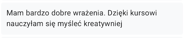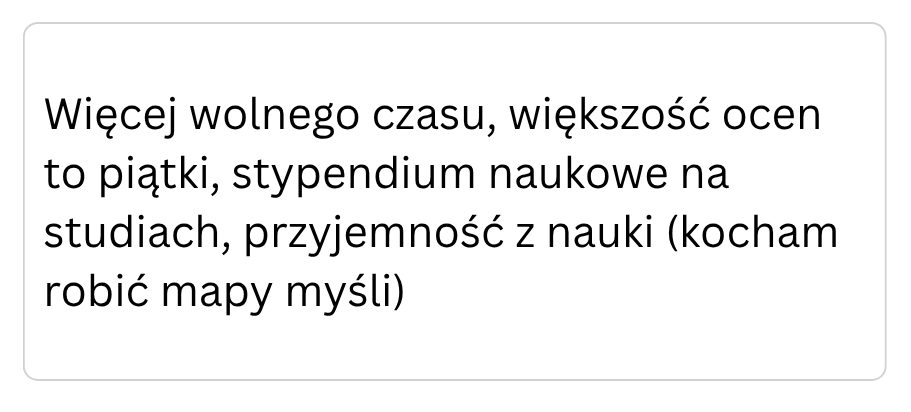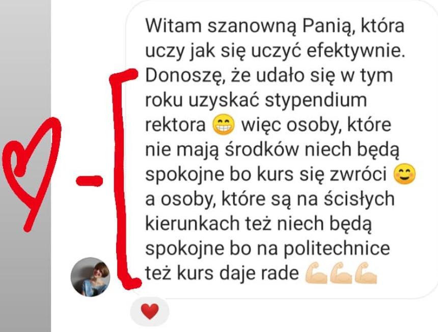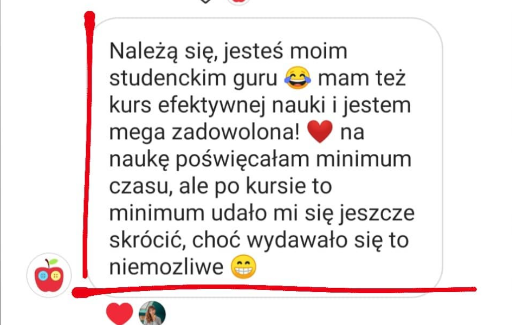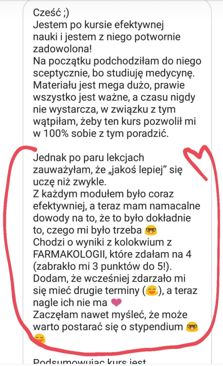 "Jestem po kursie efektywnej nauki i jestem z niego potwornie zadowolona! Na początku podchodziłam do niego sceptycznie, bo studiuję medycynę. Materiału jest mega dużo, prawie wszystko jest ważne, a czasu nigdy nie wystarcza, w związku z tym wątpiłam, żeby ten kurs pozwolił mi w 100% sobie z tym poradzić. Jednak po paru lekcjach zauważyłam, że „jakoś lepiej” się uczę niż zwykle. Z każdym modułem było coraz efektywniej, a teraz mam namacalne dowody na to, że to było dokładnie to, czego mi było trzeba 🤓 Chodzi o wyniki z kolokwium z FARMAKOLOGII, które zdałam na 4 (zabrakło mi 3 punktów do 5!). Dodam, że wcześniej zdarzało mi się mieć drugie terminy (😅), a teraz nagle ich nie ma ❤️ Zaczęłam nawet myśleć, że może warto postarać się o stypendium 🤓😄 Podsumowując kurs jest NIESAMOWITY! Jestem zachwycona efektami po nim i bardzo dziękuje, że zrobiłaś coś tak świetnego ❤️"