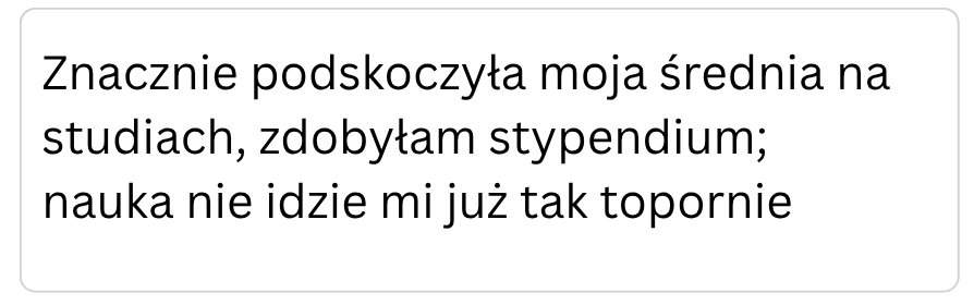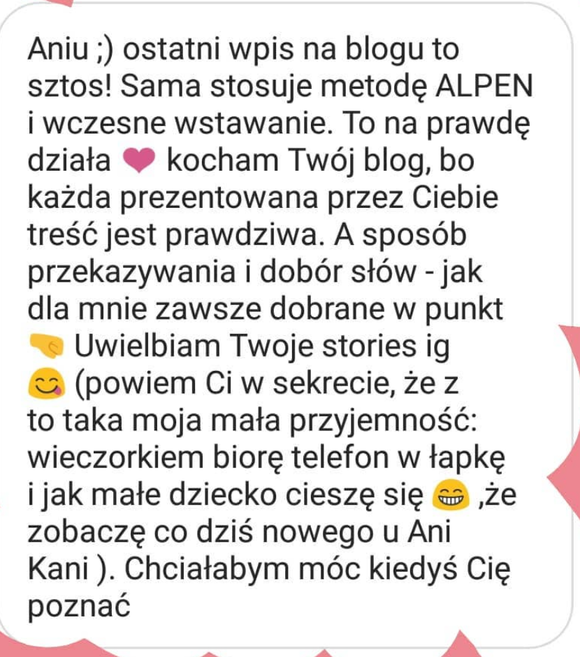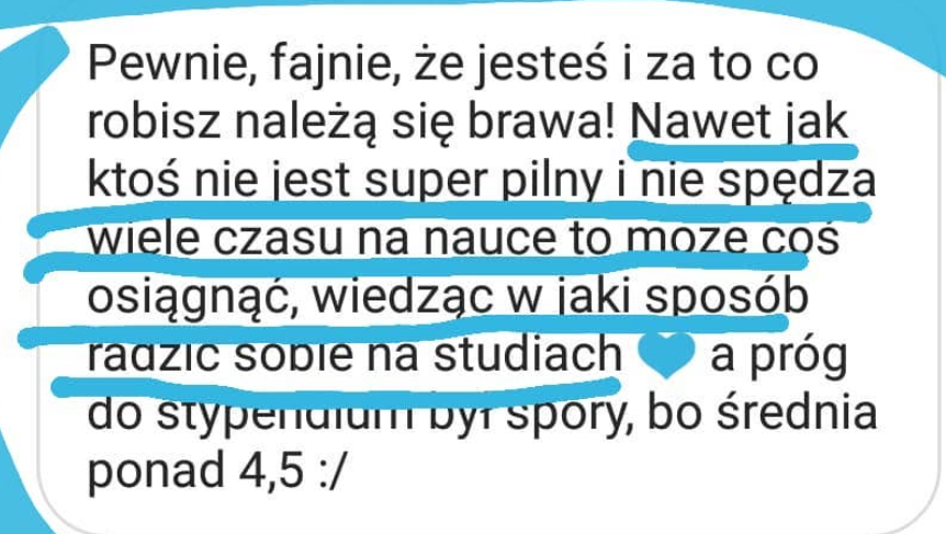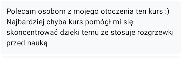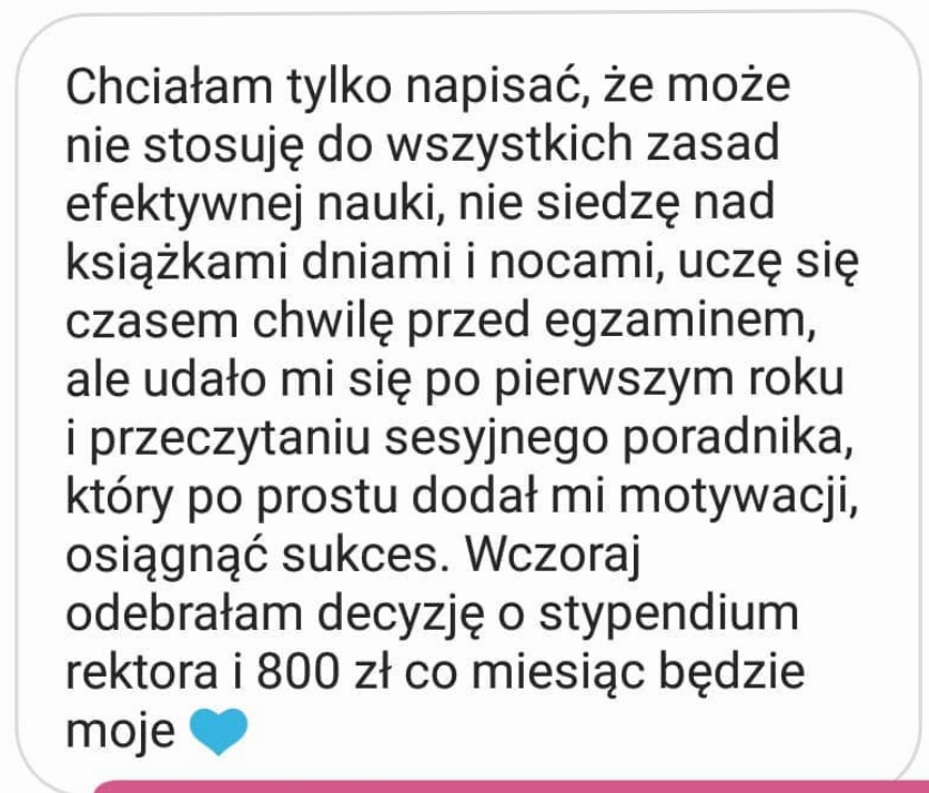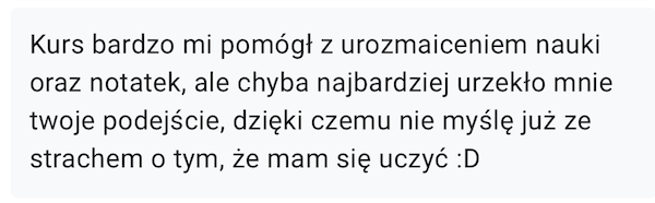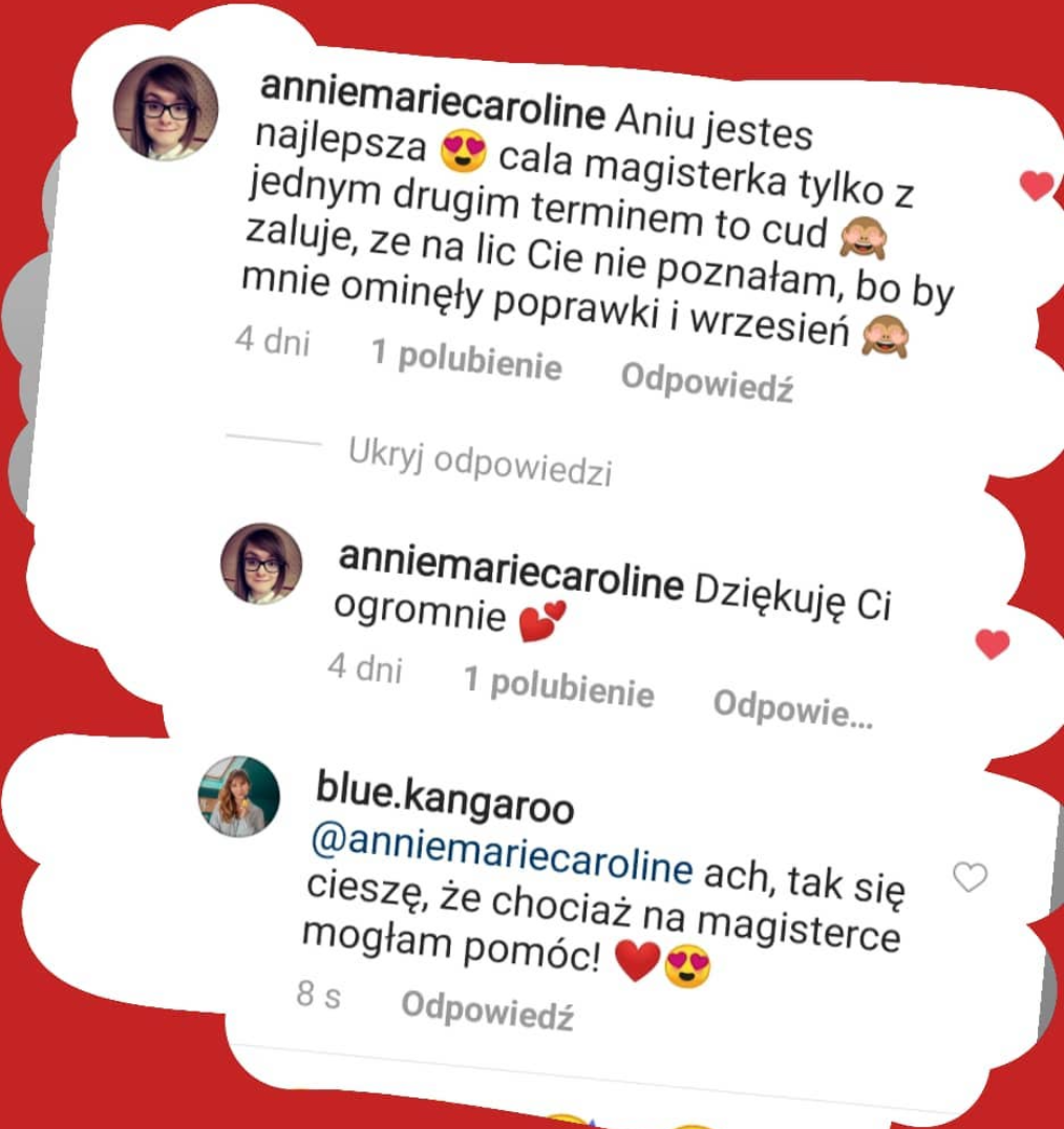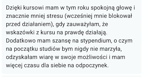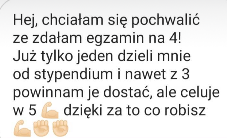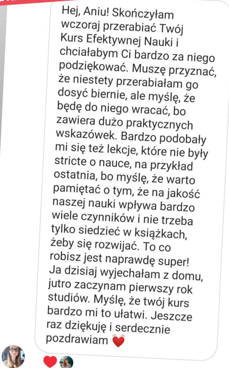 "Aniu, pewnie dostajesz masę takich wiadomości, ale nie mogłam się powstrzymać! Kupiłam Twój kurs i mam pierwsze efekty! Jestem już na czwartym roku, a moim problemem jest stres. Zaczęło się to poważnie odbijać na moim zdrowiu i miałam już dość. Twoje rady podziałaly! Odzyskalam kontrolę, nie balam się egzaminu i uczyłam z przyjemnością. Aniu, dziękuję Ci za ten kurs! Odmienil wszystko. Dostałam 5 z egzaminu ale już kit z tą oceną. Najważniejsze, że odzyskalam spokój! Dziękuję! 😍😍😍